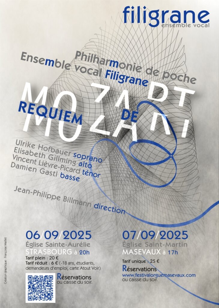Filigrane s’empare de ce monument pour en proposer une version puissante en extrayant toute l’urgence et l’expressivité présente dans cette œuvre inachevée par Mozart du fait de sa mort. Pour ce faire, l’ensemble s’entoure de musiciens de premier ordre avec l’orchestre la Philharmonie de poche dont la qualité et les projets sont salués par tous et quatre solistes à la carrière internationale : la soprane Ulrike Hofbauer, l’alto Elisabeth Guillming, le ténor Vincent Lièvre-Picard et la basse Damien Gastl.