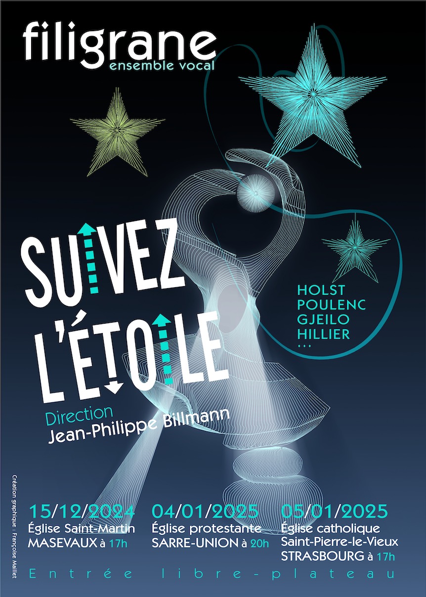 Une étoile, une naissance, un destin. Avec ce tout nouveau programme de Noël, l’ensemble vocal Filigrane vous propose de mettre en lumière « le chemin de Noël ». Celui, symboliquement, de la période de l’Avent, mais aussi le chemin, éclairé par une Étoile et nous menant droit à l’étable sacrée. Au gré de pièces chorales à découvrir de Francis Poulenc, Frank Martin, Michael Wise et Gustav Holst, retrouvez les chants traditionnels de Noël qui vous sont chers, suivons l’Étoile et partons à la rencontre du Nouveau-né !