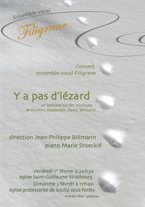 Filigrane vous propose un bestiaire, un programme inspiré par les animaux. De la renaissance jusqu’à nos jours, nous entendrons les histoires d’une abeille, de trois beaux oiseaux, d’un chat, d’un cygne, d’un dromadaire et de bien d’autres encore. Sur des musiques de Banchieri, Ravel, Hindemith, Poulenc, Milhaud, Whitacre… tous les animaux sont là, enfin presque… y’a pas de lézard !